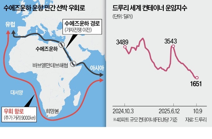 가자지구 전쟁 전 해당 노선은 유럽 수출의 핵심 통로였다. 한때 전 세계 해운 물동량의 12%가 홍해 항로를 통과했다. 컨테이너 교역으로 한정하면 글로벌 비중은 30%에 달했다. 홍해는 전 세계 원유 및 액화천연가스(LNG) 시장의 동맥이기도 했다. 전 세계 LNG 수입량 정도가 이 운하를 이용했다.